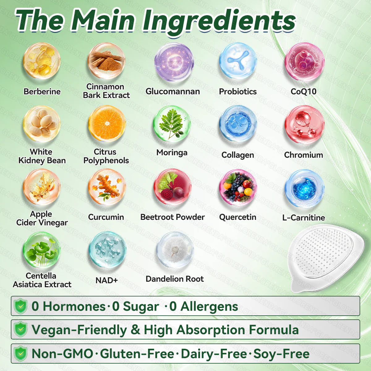 Specially formulated with Resveratrolย to help rebuild and rebalance the gut microbiome. By restoring beneficial bacteria levels, it helps reduce gut inflammation at the source and supports relief from recurring bloating, constipation, indigestion, and acid refluxโbringing your digestive system back to a smoother, more stable state of gut health. Apple cider vinegar powder, white kidney bean extract, and cinnamon extract work synergistically on carbohydrate metabolism and gut motility by reducing digestive enzyme activity and supporting hepatic and biliary detoxification and bile flowโpromoting fat digestion, nutrient absorption, and endotoxin clearance to maintain a more balanced intestinal environment. Moringa, green tea extract, and coriander seed extract, rich in natural polyphenols, help inhibit pathogenic bacteria, support the expansion of beneficial probiotics, and enhance microbiome diversity, improving bloating, irregular bowel movements, and overall digestive discomfort.